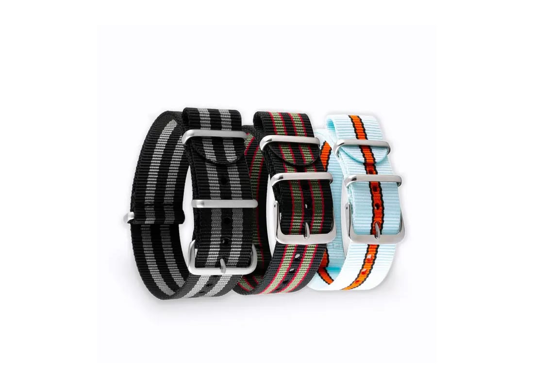 Bien que ces deux styles soient composés d’une seule pièce de nylon passant sous la montre, ils affichent des caractères bien distincts. Le bracelet NATO possède des passants rectangulaires fins et une sangle supplémentaire qui crée une double épaisseur de tissu sous le boîtier pour plus de sécurité. C’est le choix idéal pour un look polyvalent, capable de s’adapter à des situations plus formelles.