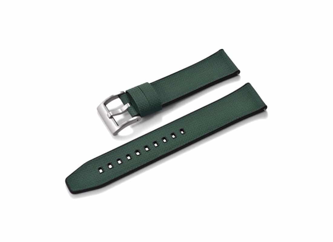Add a touch of sporty and technical style to your wrist with the KronoKeeper double layer FKM rubber watch strap, presented here in dark green. Comfortable, flexible, and ultra-resistant to heat, water, and UV rays, it is ideal for enthusiasts of robust watches. Its sailcloth texture, integrated quick-release spring bars, and stainless steel pin buckle offer everyday practicality and elegance. Compatible with most watches, it is available in 11 colors.