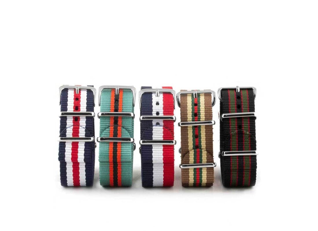 Available in refined color combinations such as Blue/White/Red, Blue/Orange/Black, Blue/White/Red Flag, Black/Red/Khaki, Brown/Beige/Green/Red, it allows you to personalize your watch according to your style or the occasion.