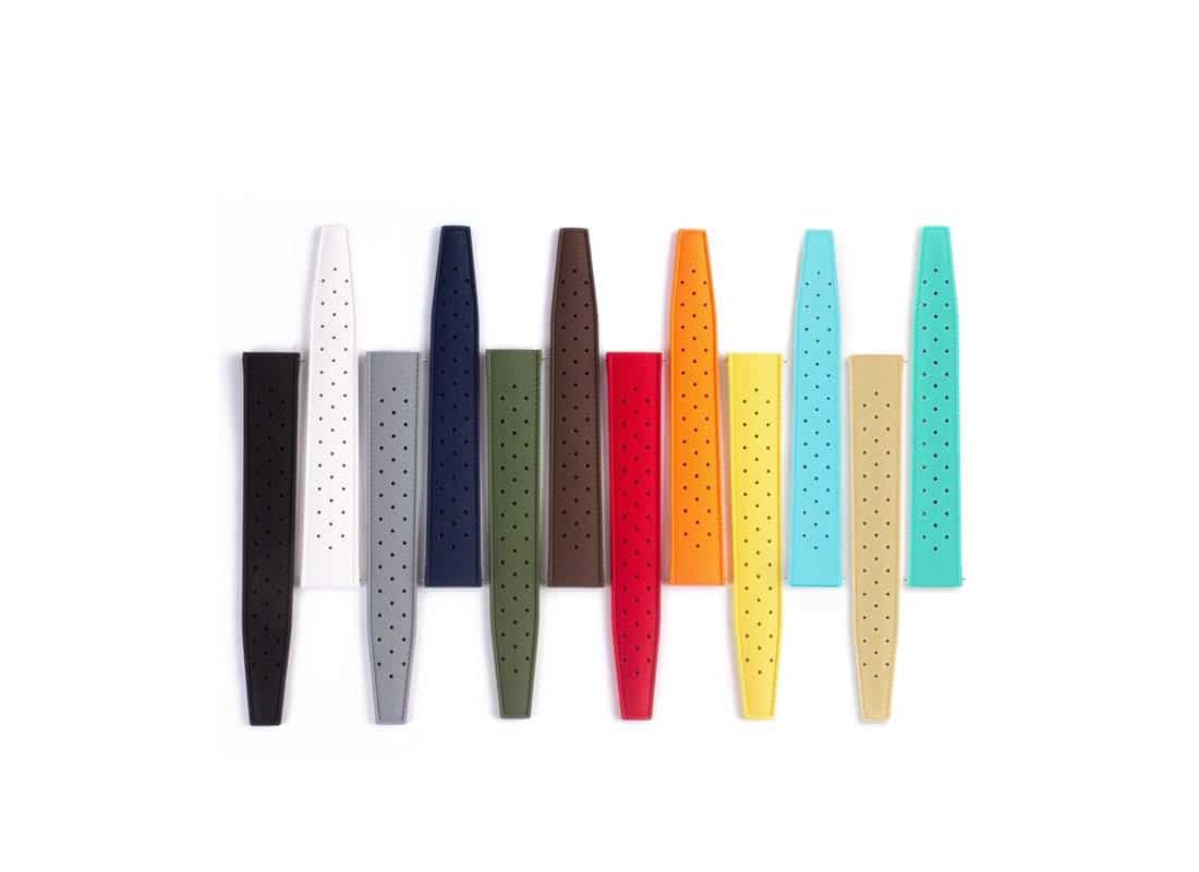 Its Tropic look, with a subtly textured pattern, evokes classic dive watch straps while maintaining the necessary refinement to harmonize with Apple Watch cases. Available in a wide range of colors — black, white, gray, blue, green, brown, red, orange, yellow, light blue, beige, turquoise — it adapts to all tastes, outfits, and occasions (sports, work, leisure). Its beveled tip visually elongates the strap for an elegant look on the wrist.