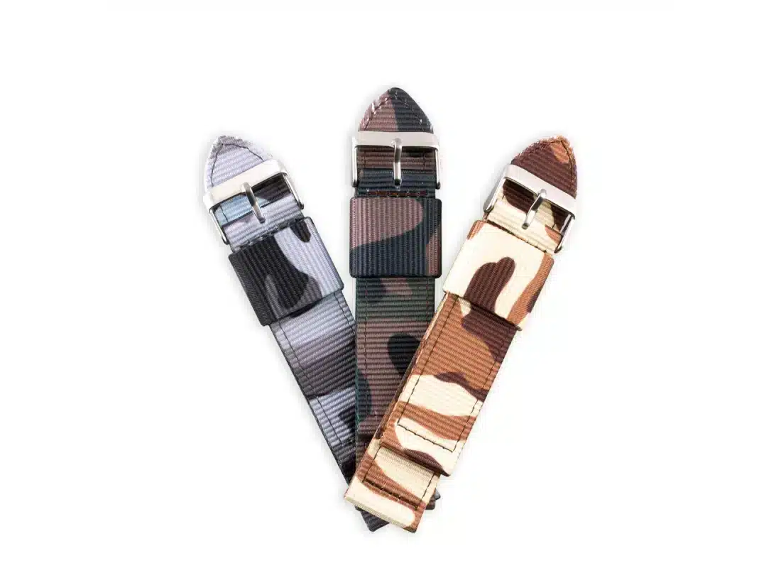 Combining robustness, military style, and comfort, the two-piece camouflage nylon watch strap embodies the ‘tactical chic’ spirit. Designed to withstand daily use, it is made of waterproof nylon/fabric, perfect for facing inclement weather or active conditions. The camo pattern is available in three carefully selected shades – brown, brown/green, and grey – to match your taste and wardrobe.
