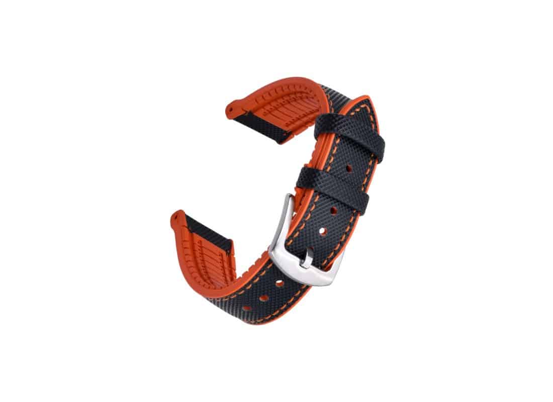 The KronoKeeper “Jules” strap is designed for sports watch enthusiasts, combining style, robustness, and comfort. Made from FKM rubber, it offers exceptional resistance to water, heat, UV rays, and chemicals. Its two-tone orange and navy blue design, combined with internal ventilation channels, ensures excellent comfort even during intense activities. Available in two sizes (20/18 mm and 22/20 mm), it easily adapts to most watches. Shipping within 4 to 10 days.