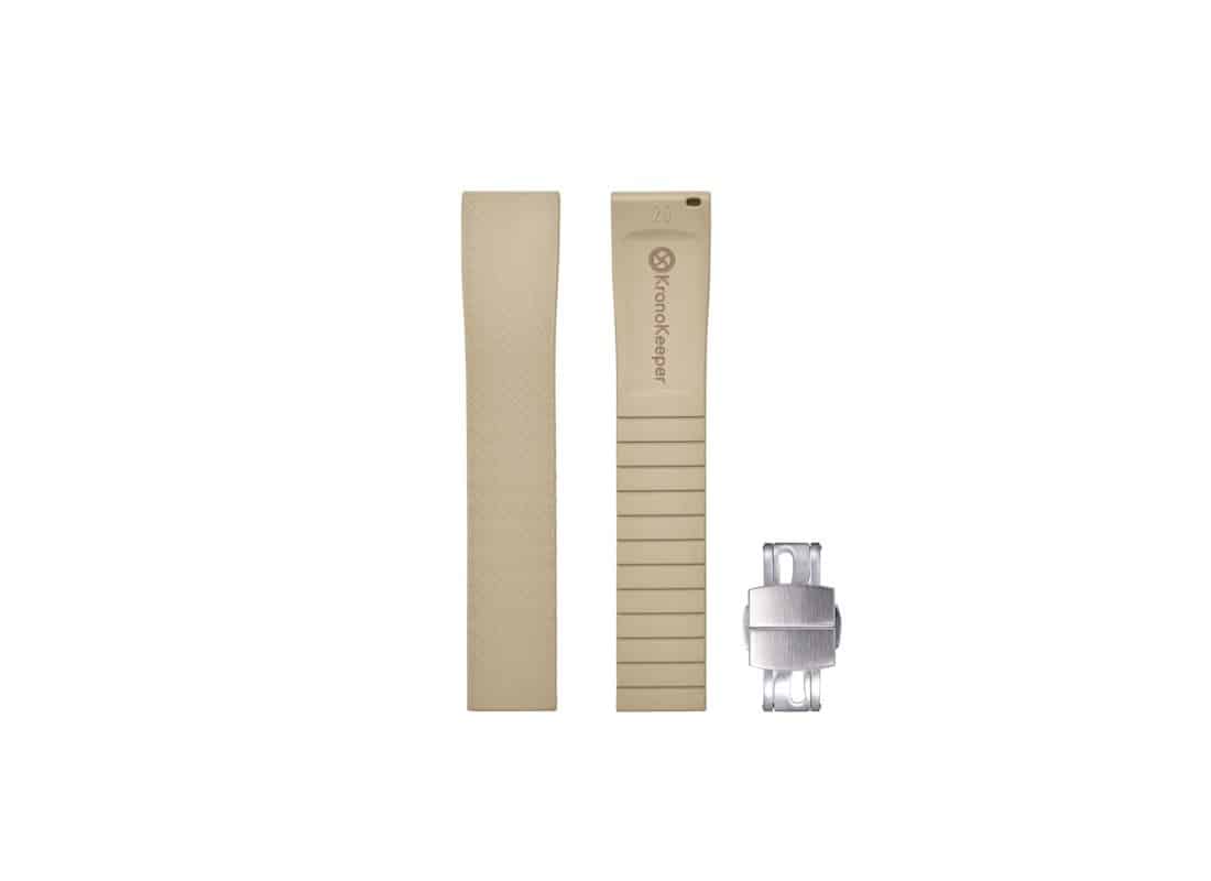 Combining sporty style and high-end comfort, this KronoKeeper khaki FKM rubber watch strap offers excellent resistance to heat, humidity, and dust. Adjustable for wrists from 15 to 20 cm, it features a brushed stainless steel deployant clasp with a secure spring-bar system. Ideal for daily, sports, or underwater use, it adapts to most watches with standard spring bars while ensuring comfort and durability.