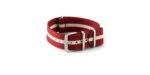 Inspiré des bracelets militaires des années 70, ce modèle revisite le classique NATO avec une touche de modernité : ses motifs à rayures bicolores – disponibles dans une large gamme de couleurs – permettent de personnaliser facilement sa montre tout en affirmant son style. Le bracelet se porte aussi bien sur une montre de plongée qu’une montre habillée, et peut être remplacé en un clin d’œil grâce à son design simple et universel.