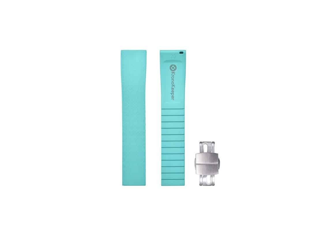 Conçu pour les amateurs de montres exigeants, le bracelet de montre en caoutchouc cyan KronoKeeper avec boucle déployante combine technicité, confort et style sport. Fabriqué en caoutchouc FKM de haute qualité, un matériau reconnu pour sa durabilité et sa souplesse, ce bracelet offre une alternative moderne et performante aux classiques bracelets en acier ou en cuir.