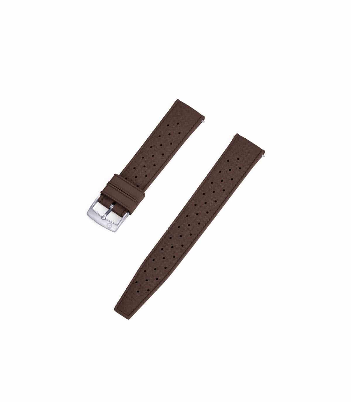 Le bracelet Tropic KronoKeeper est également disponible dans une palette de neuf coloris pour s’accorder harmonieusement avec votre montre et votre style : noir, bleu marine, vert, orange, jaune, gris, marron, blanc et rouge. La version marron présentée ici se mariera parfaitement avec un boîtier en acier vieilli, en titane ou en bronze pour une allure rétro affirmée.