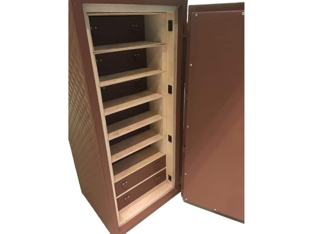 Le coffre-fort KronoKeeper 90L est conçu pour offrir une protection haut de gamme à vos montres, bijoux et objets précieux et pour accueillir plusieurs dizaines de garde-temps sur des remontoirs (jusqu’à 12) ou dans des tiroirs aménagés. Le coffre-fort 90 litres est certifié ECB•S pour la norme de sécurité vol S2 (EN 14450) et anti-feu pendant 30 minutes (EN 15659), il allie robustesse, style et fiabilité. Chaque coffre est doté d’une serrure électronique Classe B (norme EN 13000) à code à 6 chiffres, et d’un système de scellage anti-effraction complété par des pênes en « V » garantissant une haute résistance physique et thermique.