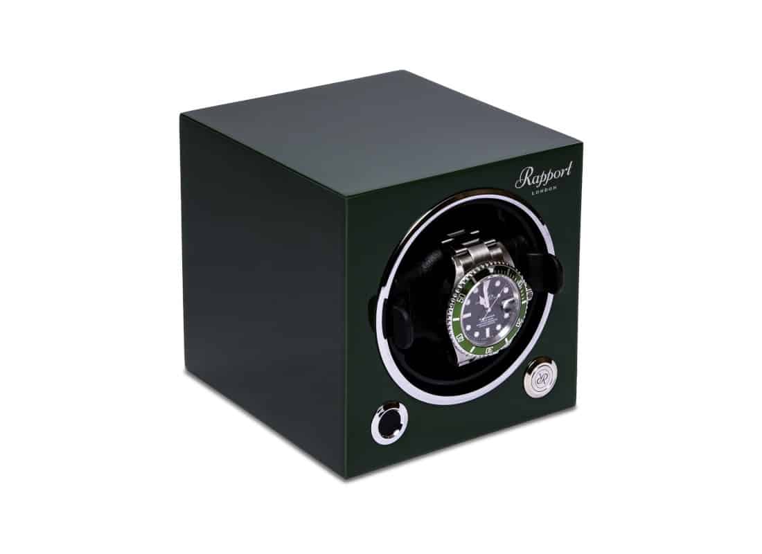 La Rapport London EVO Single Watch Winder – Racing Green incarne l’alliance élégante de la technique horlogère et du design raffiné. Ce modèle compact permet de maintenir votre montre automatique à l’heure, tout en apportant une pièce décorative qui se distingue par sa finition laquée « Racing Green » et sa fabrication artisanale.